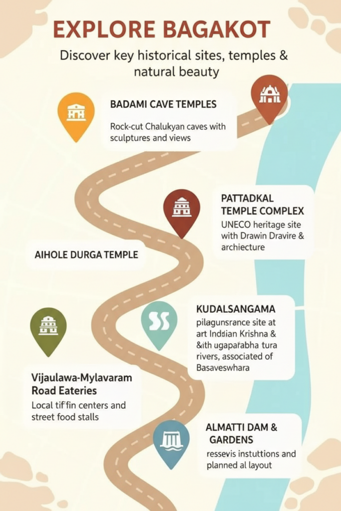 Bagalkot city and Navanagar act as the district’s gateway, connecting travelers to temples, dams, markets, and handloom clusters across the region.